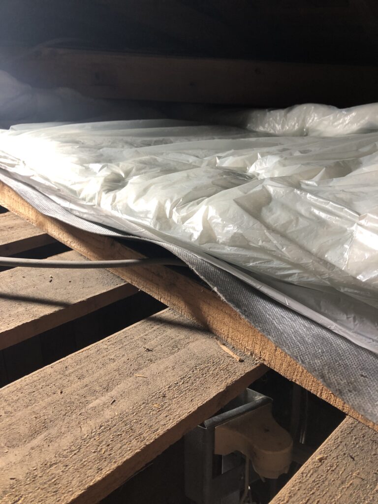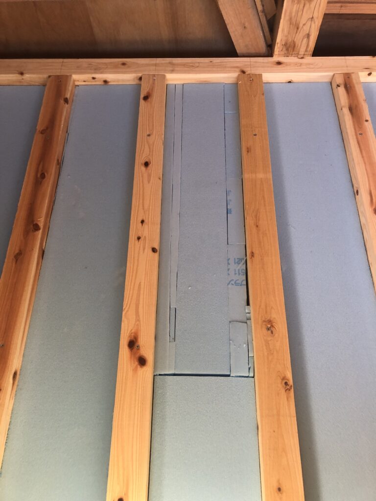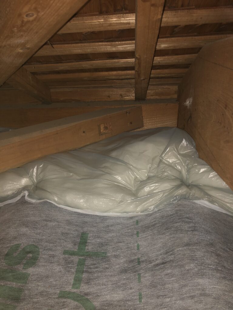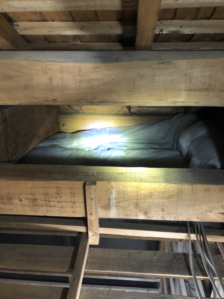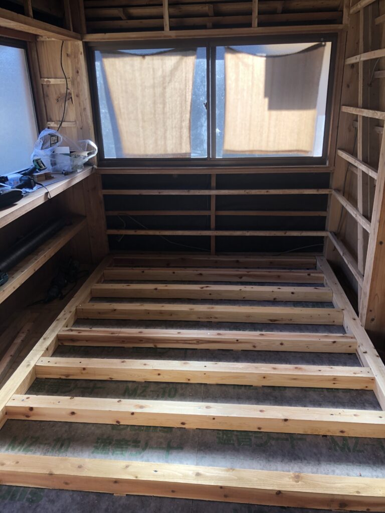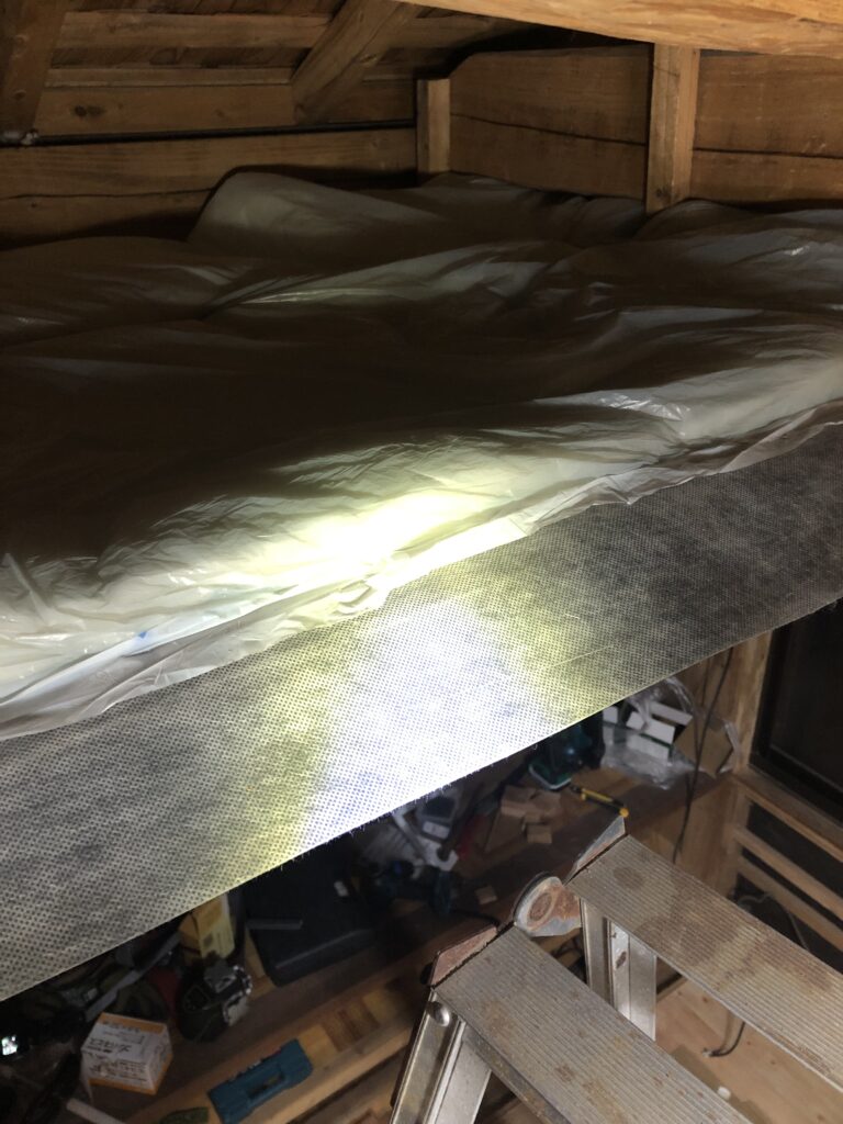 ぼっさの部屋の屋根裏の半分ぐらいのエリアに遮音シートと断熱材を入れて、今日の作業は終わりです。