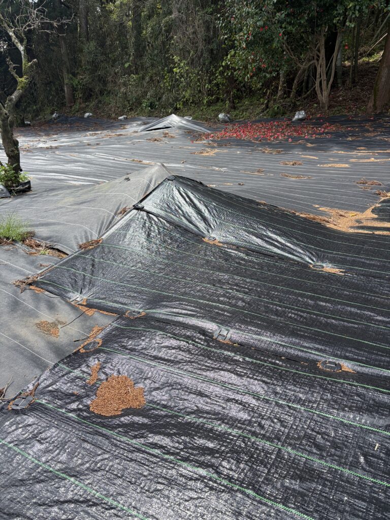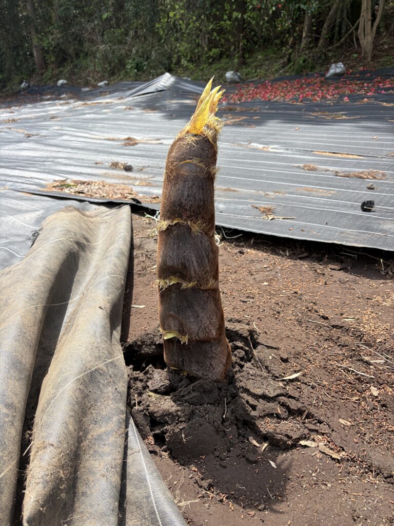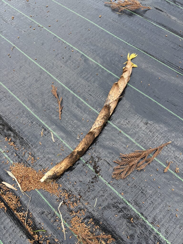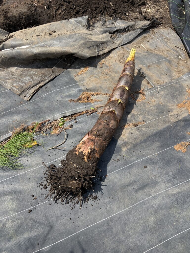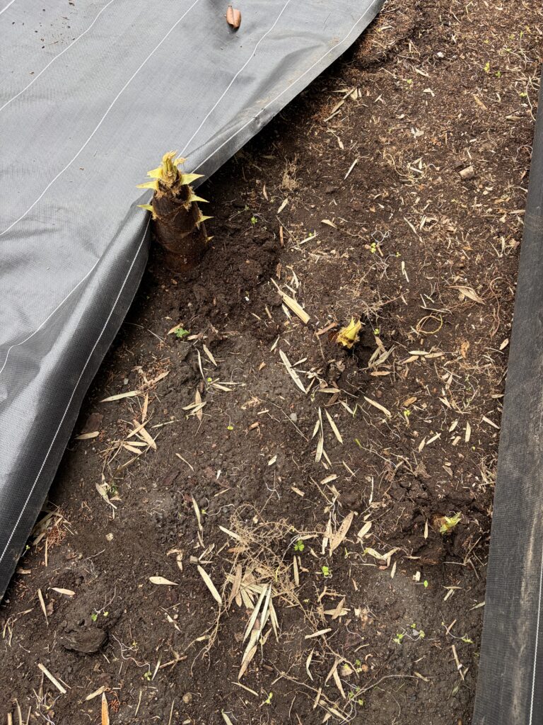 防草シートめくり、土堀り、たけのこ収穫、土戻し、防草シート戻しの繰り返しです。