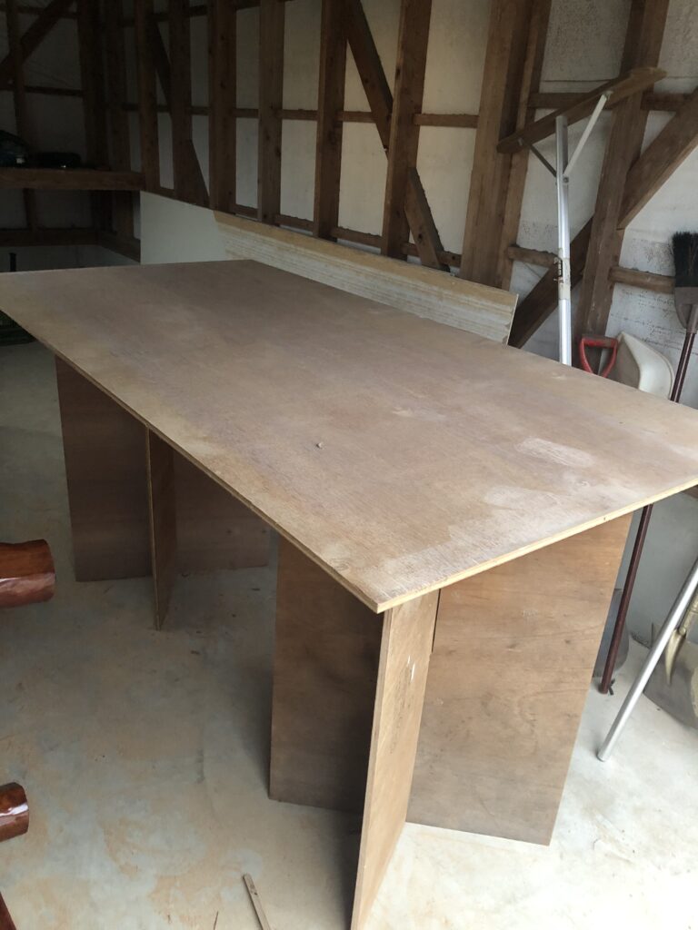 その上にコンパネを乗せて、簡易作業台の完成です。