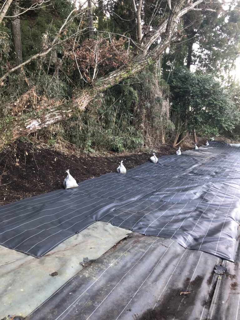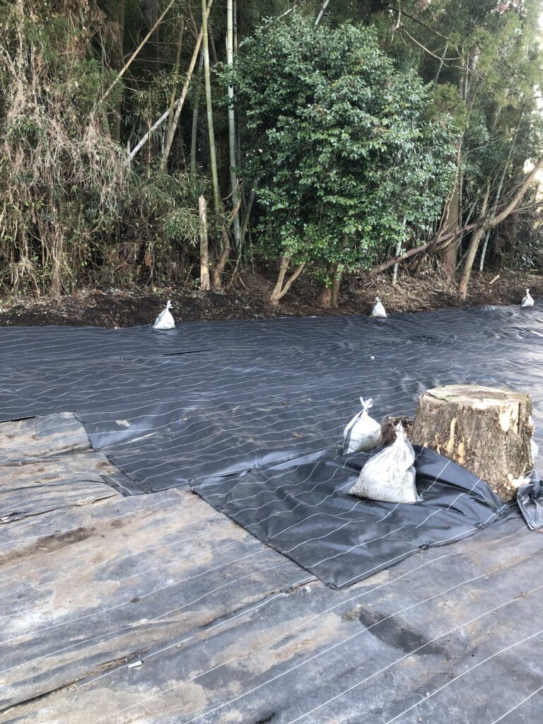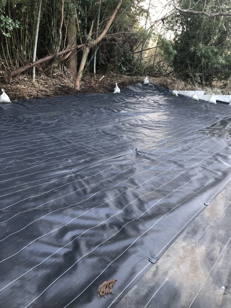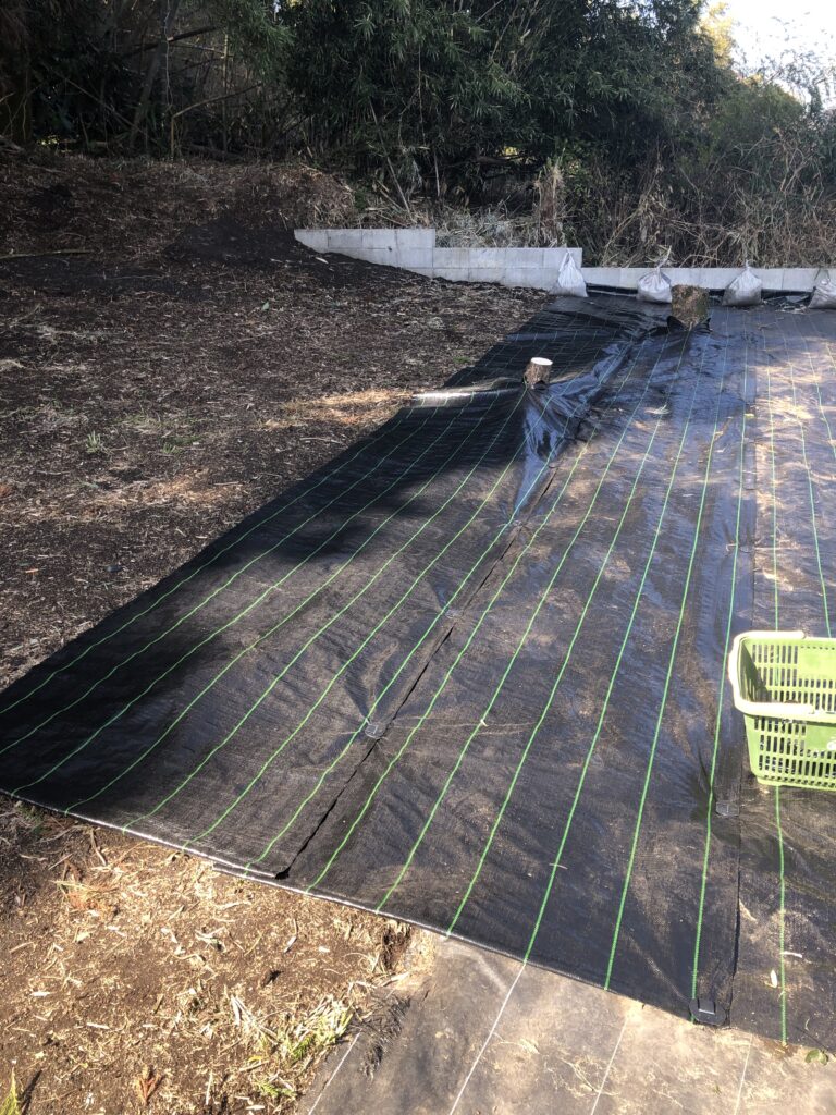 杉の枯葉や土が堆積しているので、次の列を敷く前に掃き掃除をします。