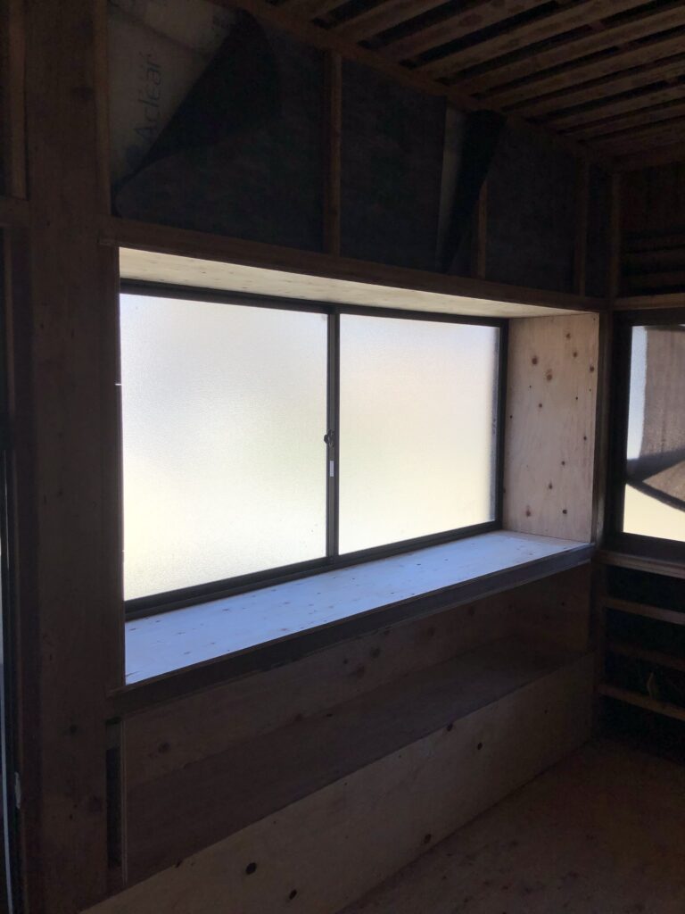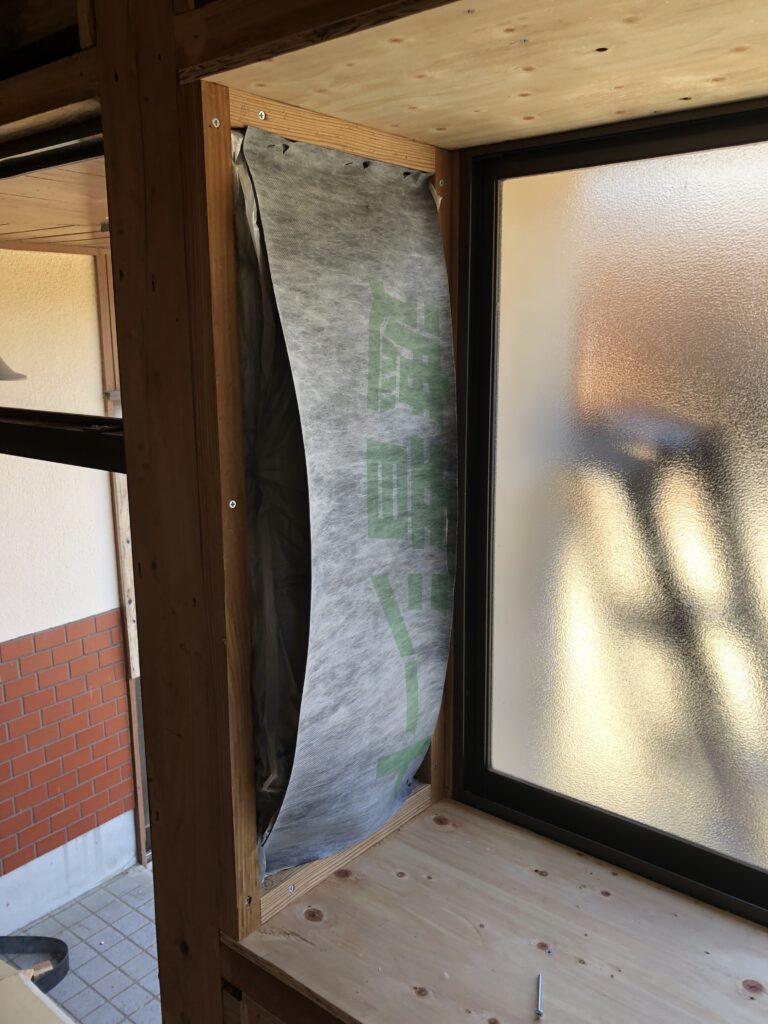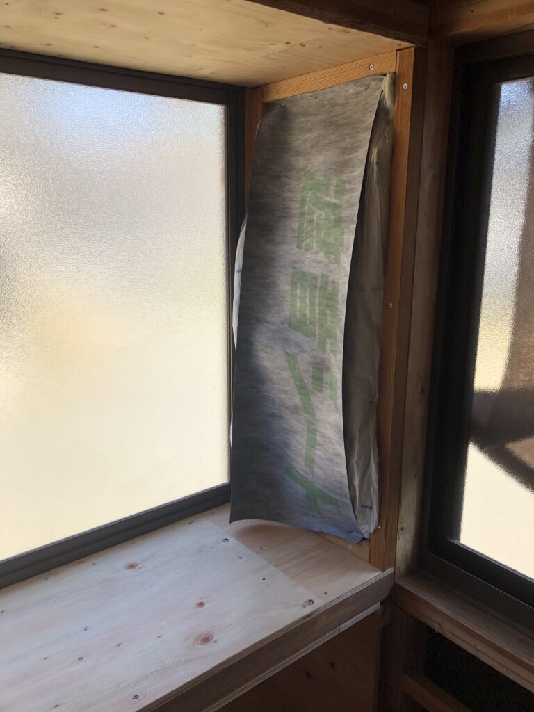 その後、窓の横側の壁に断熱材と遮音シートを入れました。