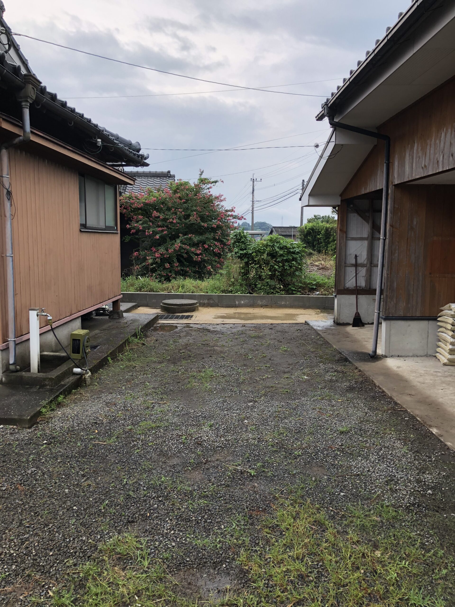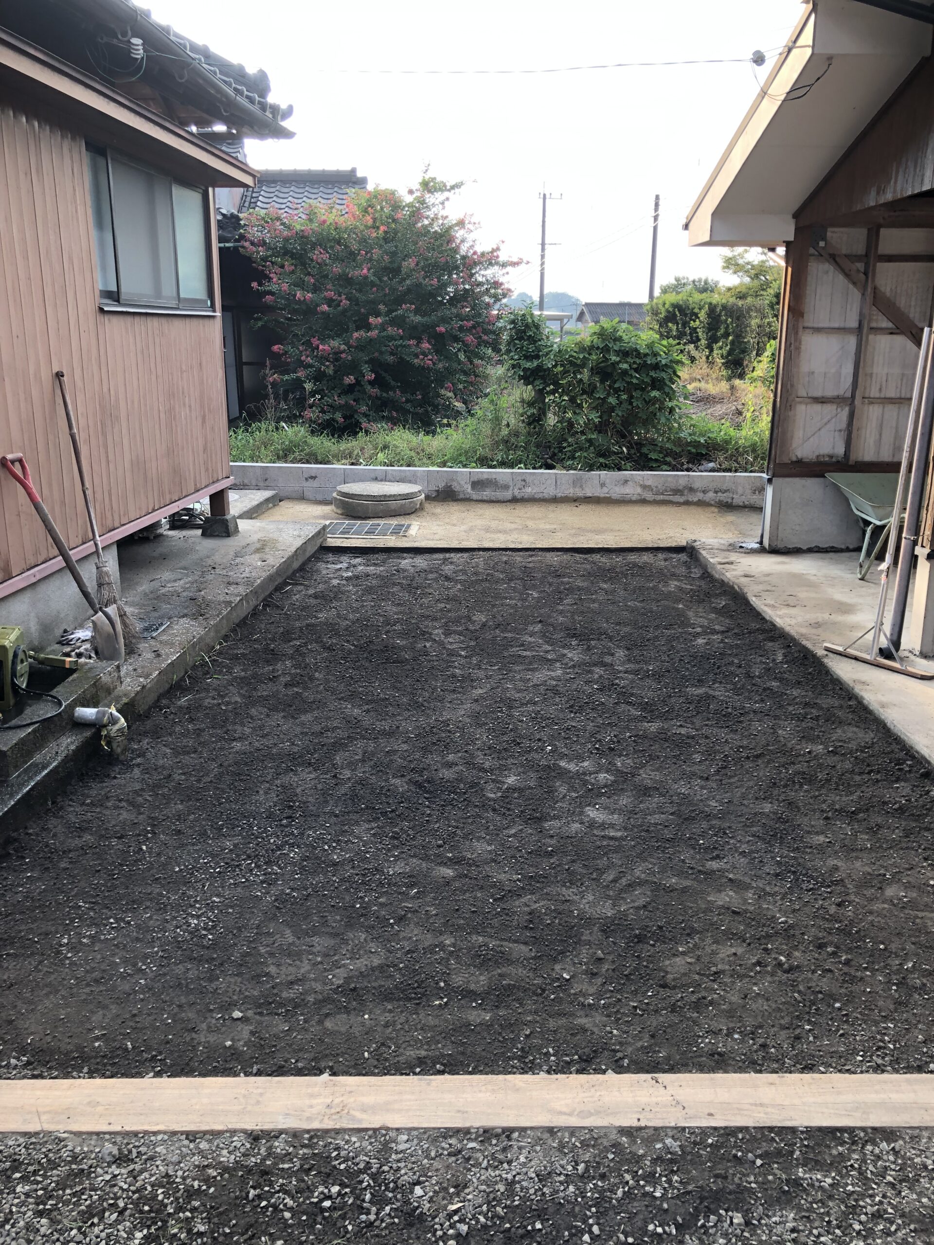敷地の南西です。昨年、敷地境界線上にブロック施行をしました。お隣さんの敷地に入っていたブロック塀も我が家の敷地におさまりました。ここの防草対策は固まる土を施行しました。草も生えず、いい感じです。お金がかかるのが、若干の難ですね。