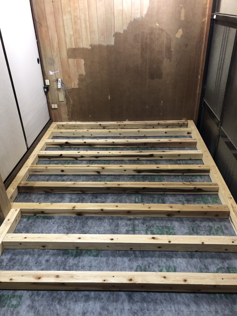木材が曲がっていたり、ビスを打ったら沈んだり浮いたり、スペーサーを駆使しながら、なんとか部屋の縁枠の根太をビスで固定しました。