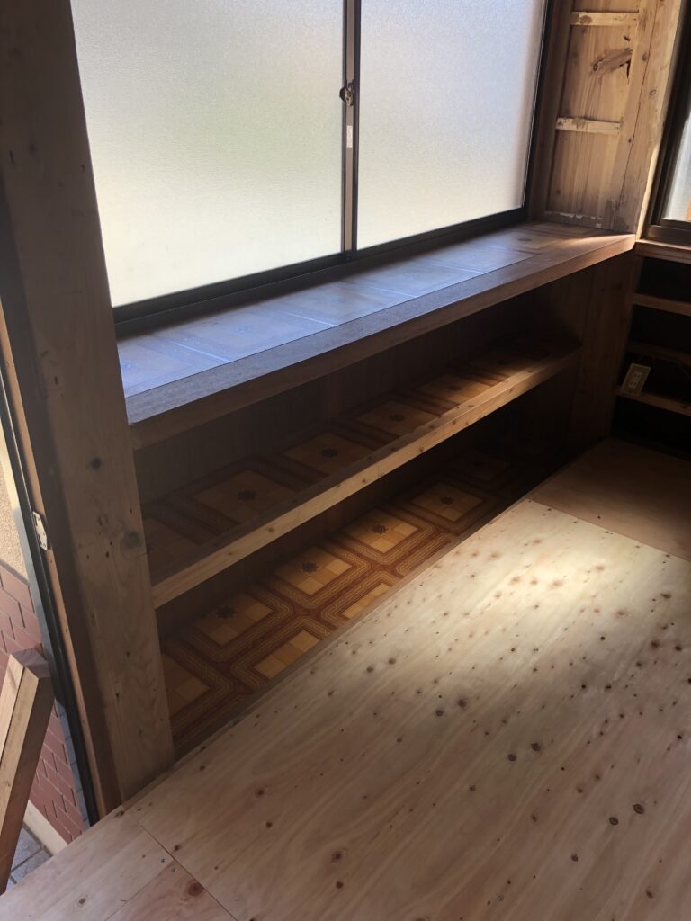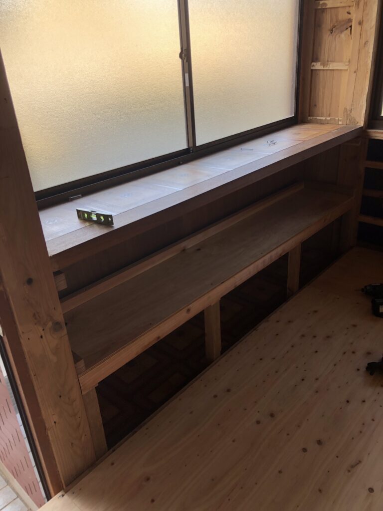 この棚は上の棚は残して下の棚は使わずにコンパネを張る予定です。