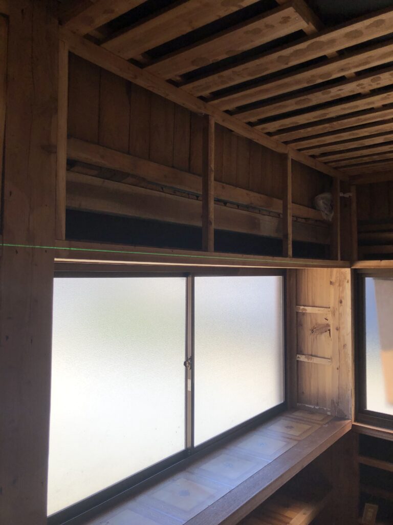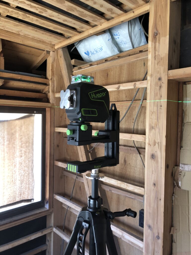 とりあえず棚の水平をレーザー墨出し器で確認します。