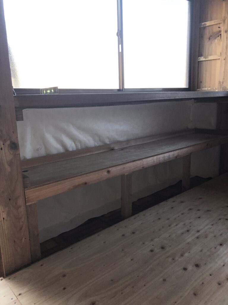 とりあえず、こちらの状態で壁側に遮音シートと断熱材、そして外の壁になるので湿防水シートを入れます。