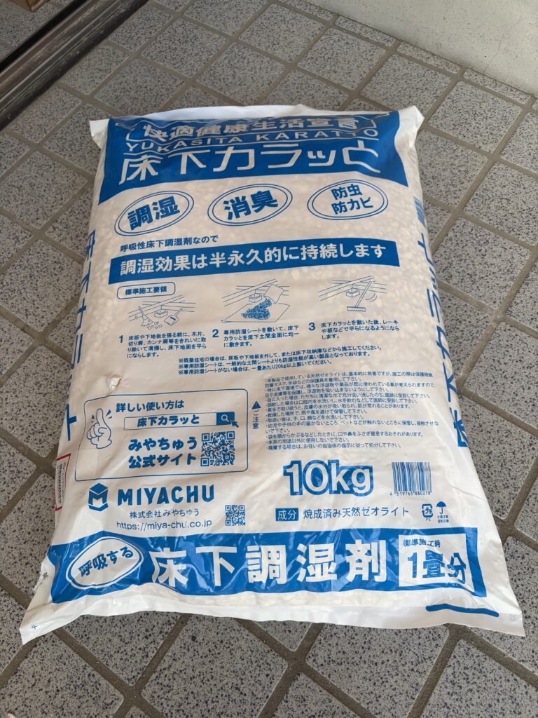昨日、コメリで買ってきた床下カラッとです。(1袋10kg入り、約1畳分)