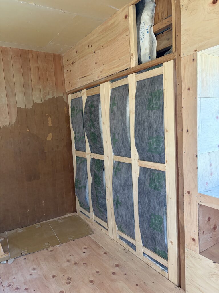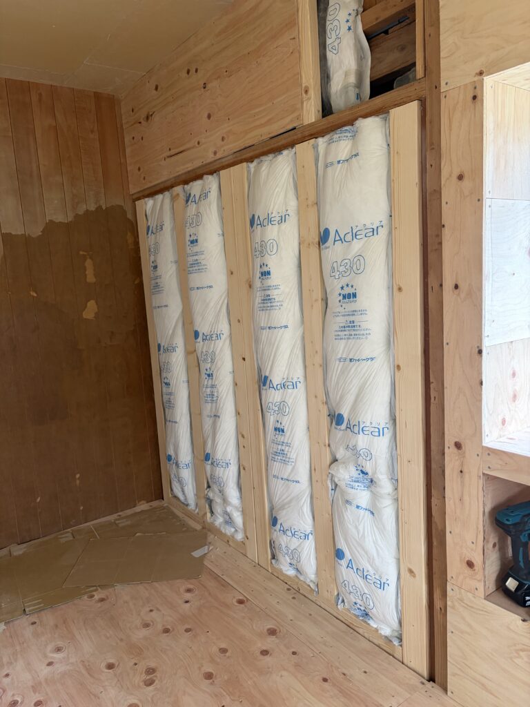 次は部屋側の壁に断熱材(アクリアマット)と遮音シートを入れます。