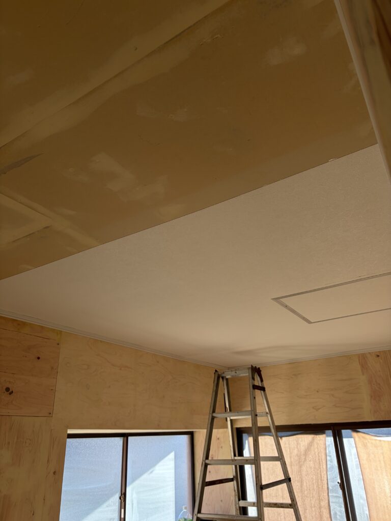 今日は朝一からかっかにお手伝いしてもらって天井に壁紙を貼っていきます。
