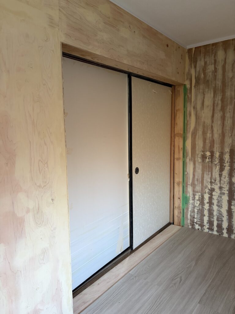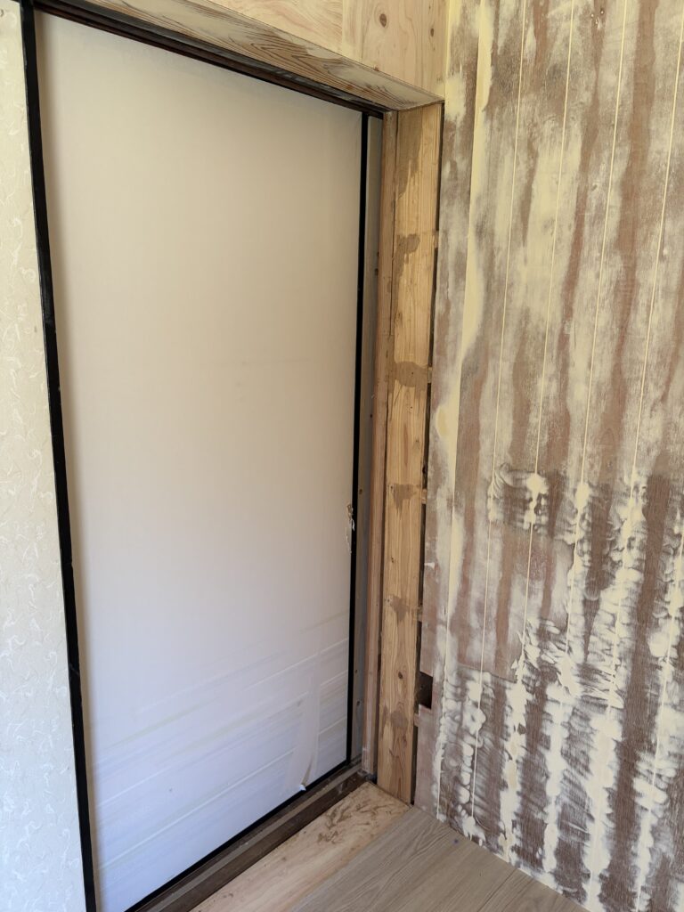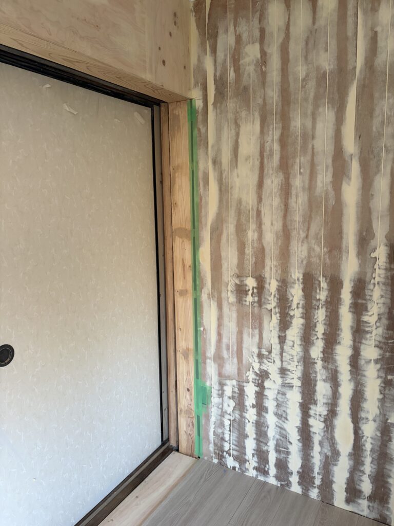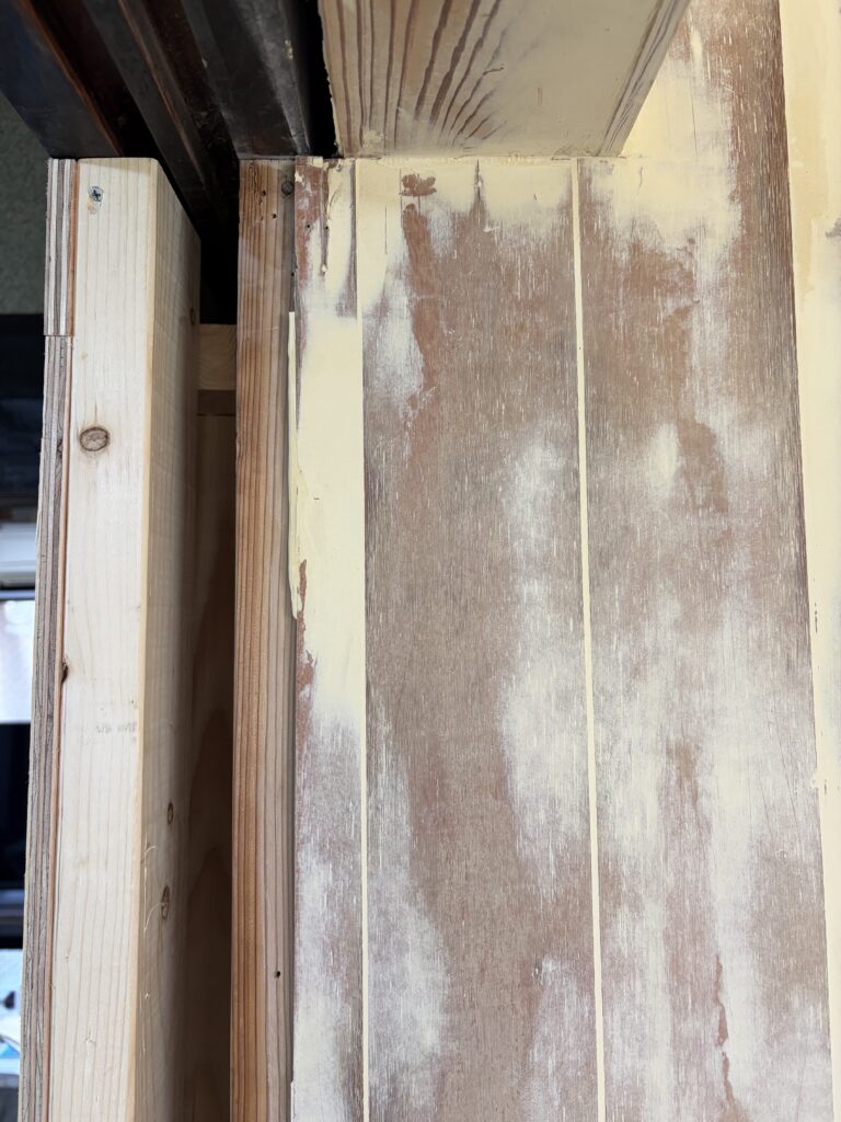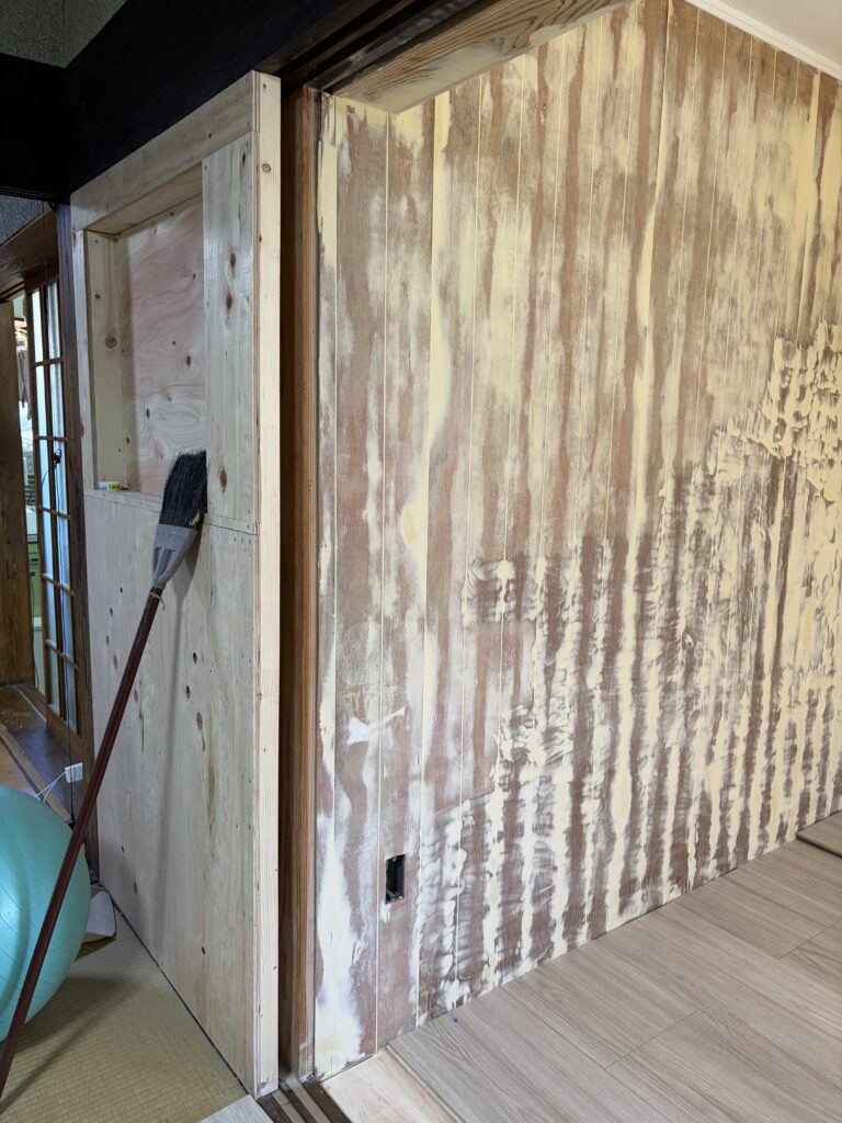 ですが、その前に柱にコンパネを張りたいので、元々あった薄いベニア板を一部切って剥がしたいと思います。